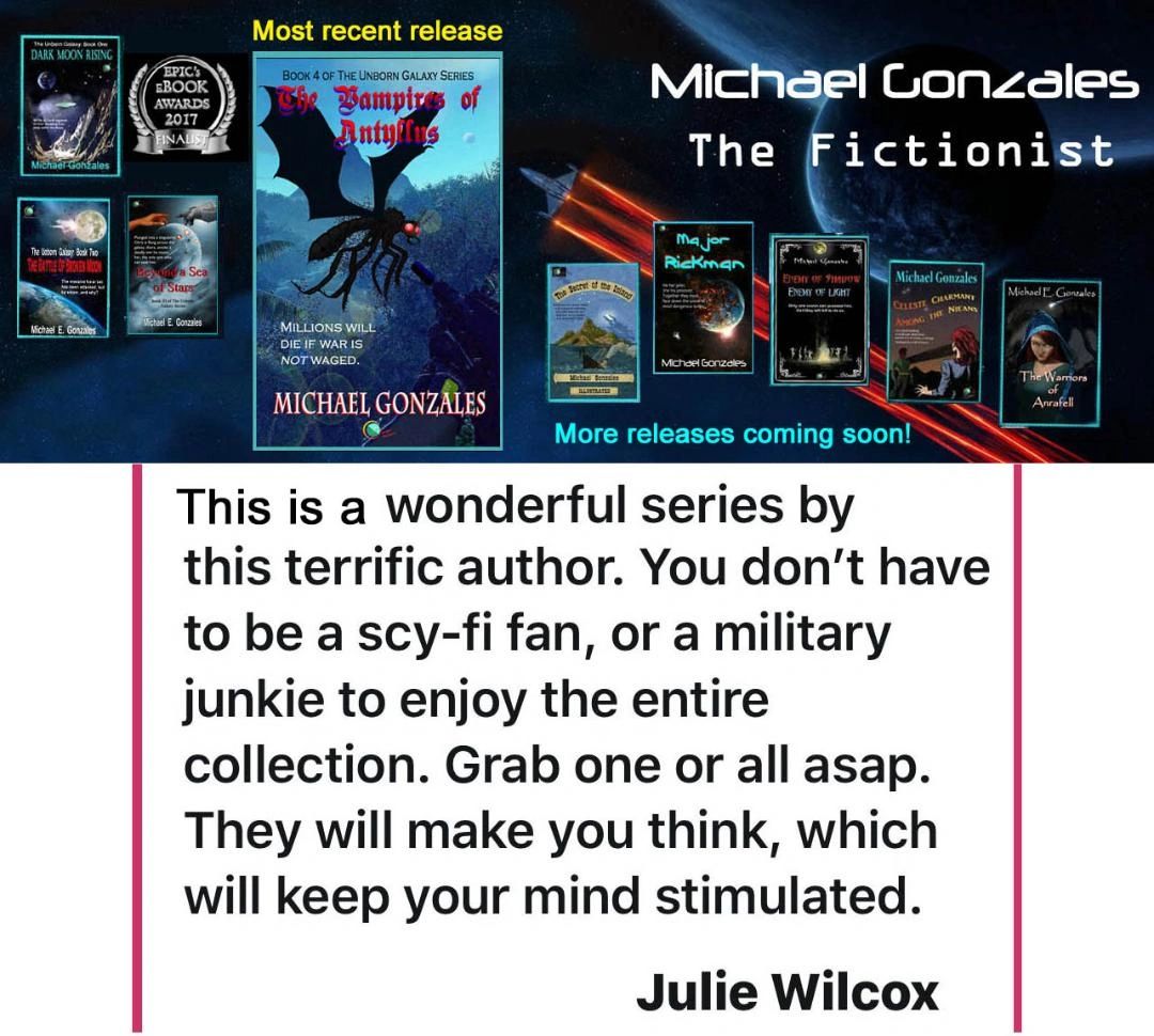 The Blue of Antyllus is a dramatic, thrilling and exciting novel that will keep readers entertained, captivated and engrossed from the very first page. Science fiction/dystopian stories are currently my go-to read so when I read the description of The Blue of Antyllus I knew that I had to read it as well as review it for all you lovely readers. Never before have I been so captivated by a dystopian story and this is thanks to the exceptional author Michael E. Gonzales and his talented literary style which kept me hooked for hours on end! The Blue of Antyllus is book five in the Unborn Galaxy series, so I am going to have to avoid spoilers, but if you want to know more about the series then I recommend reading the premise of book one called Dark Moon Rising!