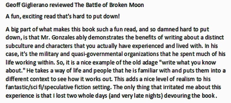 A big part of what makes this book such a fun read, and so damned hard to put down, is that Mr. Gonzales ably demonstrates the benefits of writing about a distinct subculture and characters that you actually have experienced and lived with. In his case, it's the military and quasi-governmental organizations that he spent much of his life working within. So it is a nice example of the old adage "write what you know about." He takes a way of life and people that he is familiar with and puts them into a different context to see how it works out. This adds a nice level of realism to his fantastic/sci fi/speculative fiction setting. The only thing that irritated me about this experience is that I lost two whole days (and very late nights) devouring the book instead of doing the stuff I should have been taking care of.